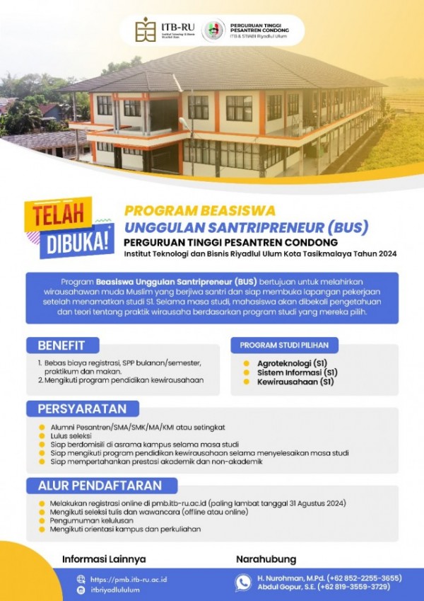 Kedua beasiswa ini dimulai untuk calon mahasiswa baru yang ingin mendaftar pada tahun ajaran 2024/2025. Kedua beasiswa tersebut bernama Beasiswa Unggulan Santripreneur (BUS) dan Beasiswa Pendidikan Kader Ulama (PKU).